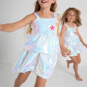 - Dazzling tiered dress adorned with shimmering sequins and vibrant star appliqués, perfect for making a bold fashion statement.